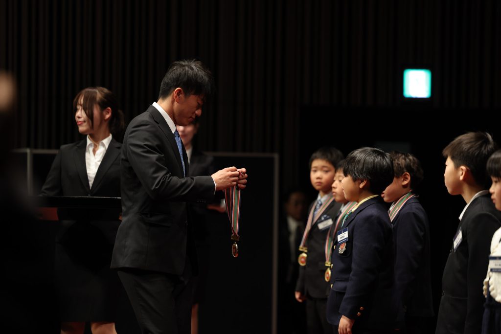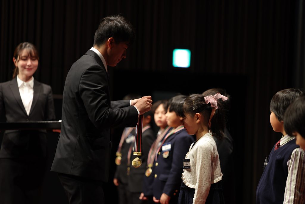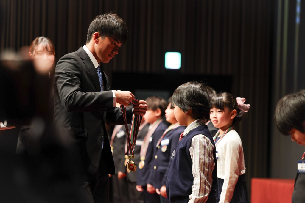 チャイルドクロスのチャンピオンたちに大倉由揮選手からメダルが渡されました。