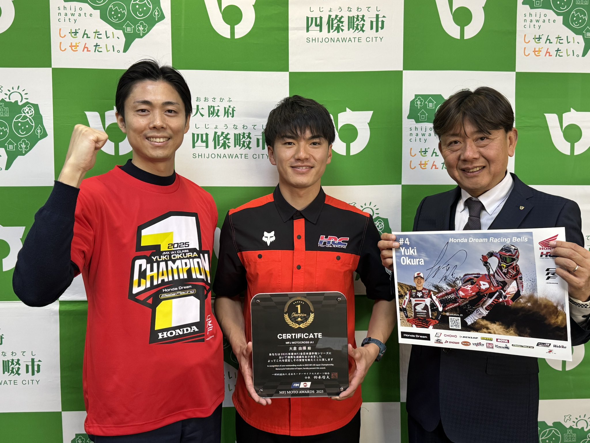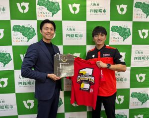 2025シーズンのIA1クラスチャンピオンを獲得したホンダドリームレーシングベルズの大倉由揮選手が大阪府四条畷市の銭谷 翔(ぜにや しょう)市長を表敬訪問