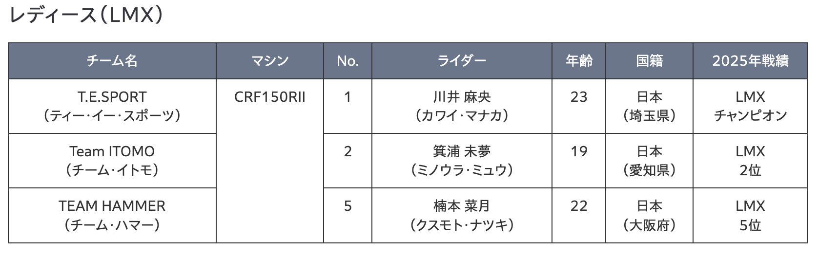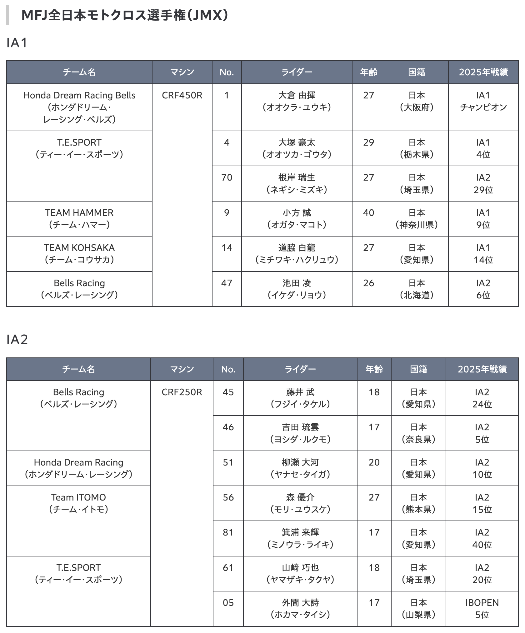 全日本モトクロスのIA1クラスは、チャンピオンの大倉選手をはじめ、キャリア最高位のランキング4位を獲得した大塚選手、そして新加入の池田選手などが紹介されています。